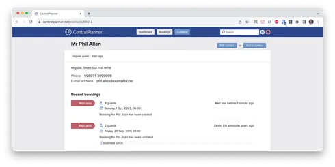 Doing business, one key aspect is good contact management. Therefore CentralPlanner stores the person behind each reservation for future reference and in order to directly recognize regular guests. Having a complete register of all your prior guests is then used to propose existing contacts when entering a reservation. The more regular guests you facilitate, the more time you will save when accepting reservations because CentralPlanner helps you to quickly recognize those regular guests while entering an reservation. Furthermore our reservationsbook encourages you to collect valuable information about any of you guests, so you may use these information during the next visit.